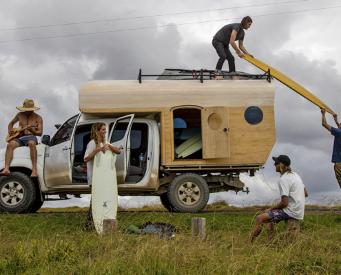 Eric Geiselman, Bryce Young, Derrick Disney and friends take self-crafted surf caravan up the NSW coast.